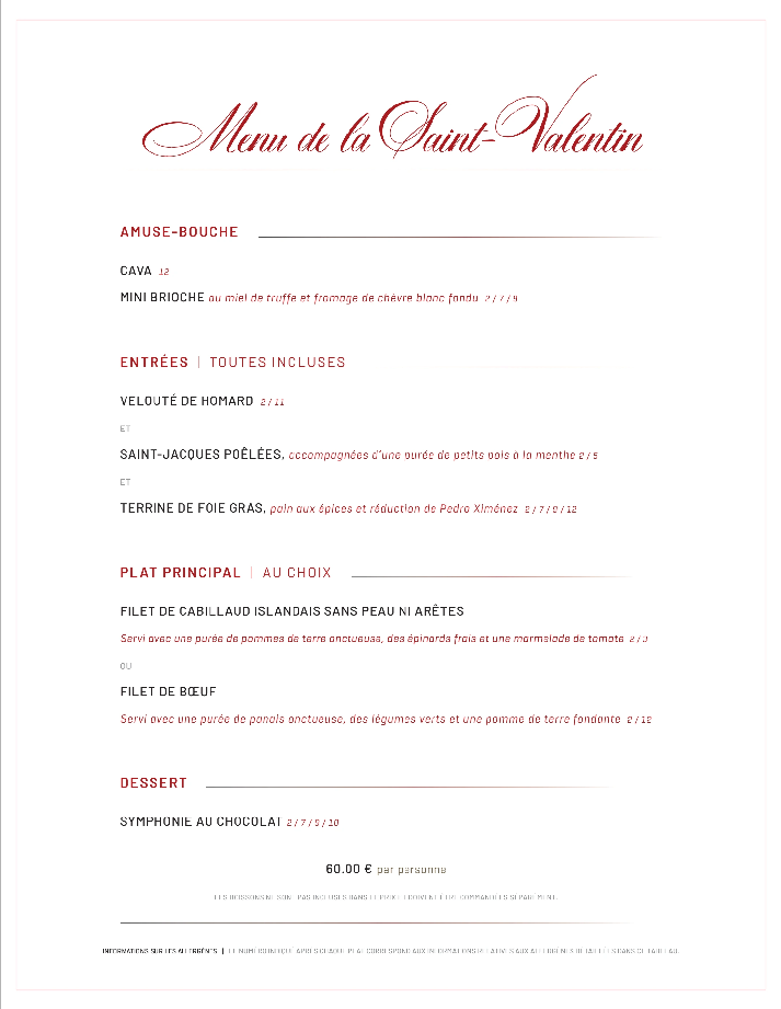 Menu Saint Valentin : 220 € pour deux (vins inclus)